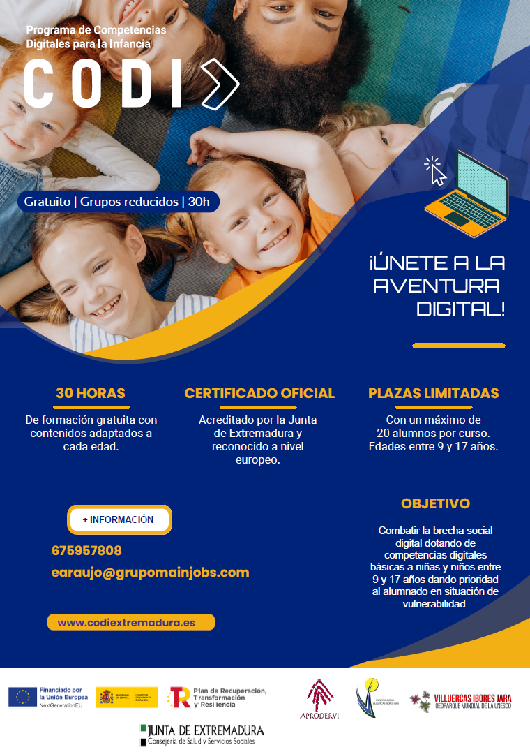 Nos complace invitarles a participar en el Programa CODI (Competencias Digitales para la Infancia), una iniciativa de la Junta de Extremadura que ofrece 30 horas de formación gratuita en competencias digitales para niños, niñas y adolescentes de 9 a 17 años.