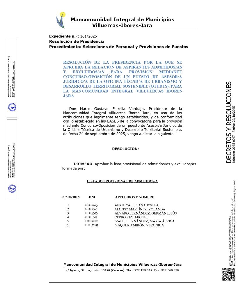 Relación de aspirantes admitidos/as y excluidos/as para provisión mediante concurso-oposición de un puesto de Asesor/a Jurídico/a de la Oficina Técnica de Urbanismo y Desarrollo Territorial Sostenible (OTUDTS). 24 octubre 2025 Documentos Listado provisional de admitidos/as y excluidos/as Asesor Jurídico. (pdf 443,6 kB)