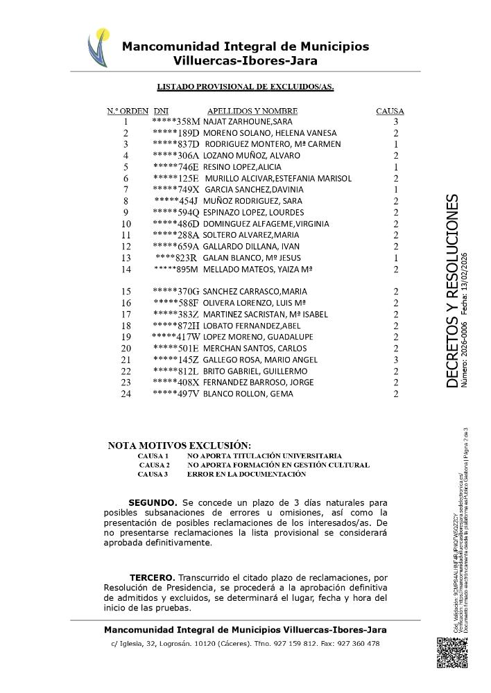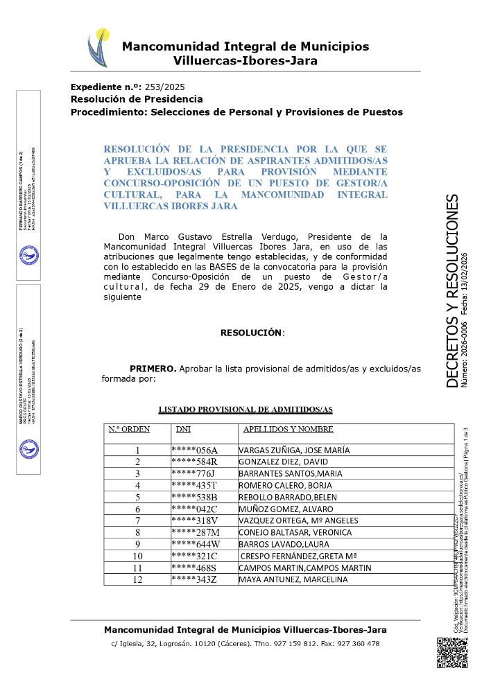 Relación de aspirantes admitidos/as y excluidos/as para la plaza de Gestor/a Cultural. 13 febrero 2026 Documentos Resolución Provisional Gestor Cultural.pdf (pdf 509,2 kB)
