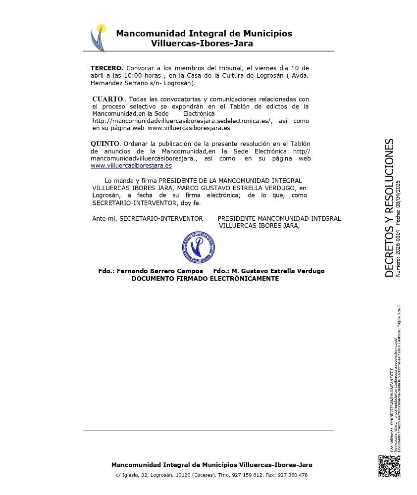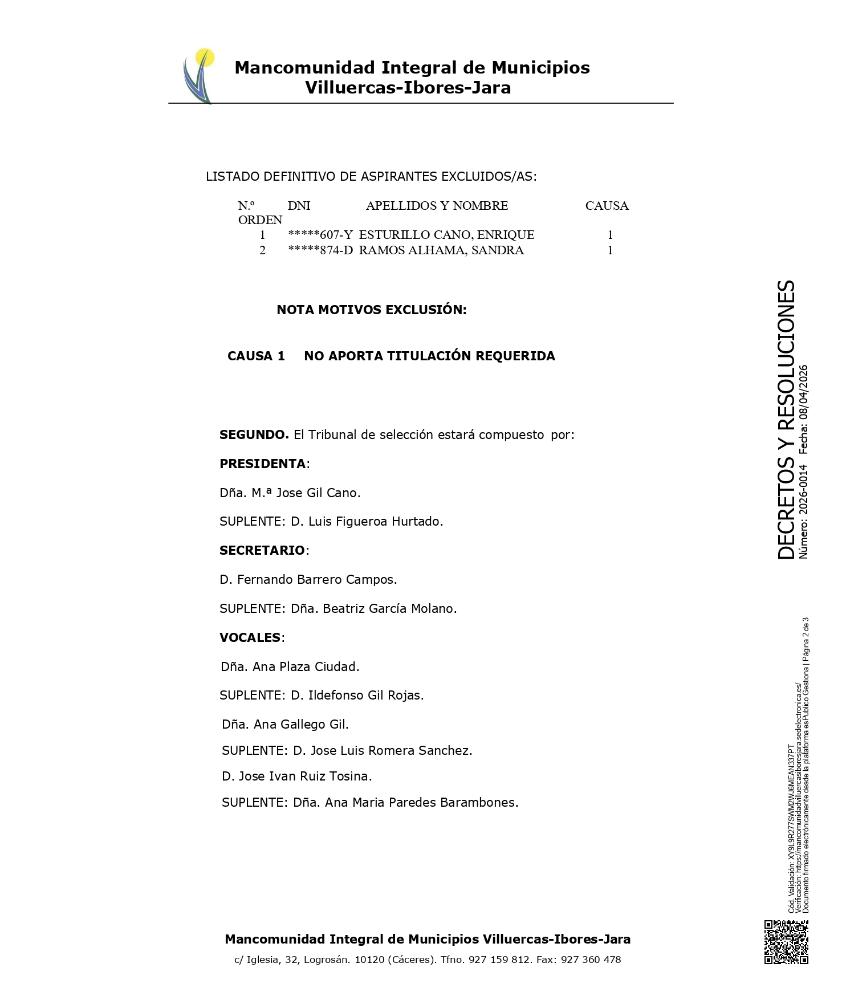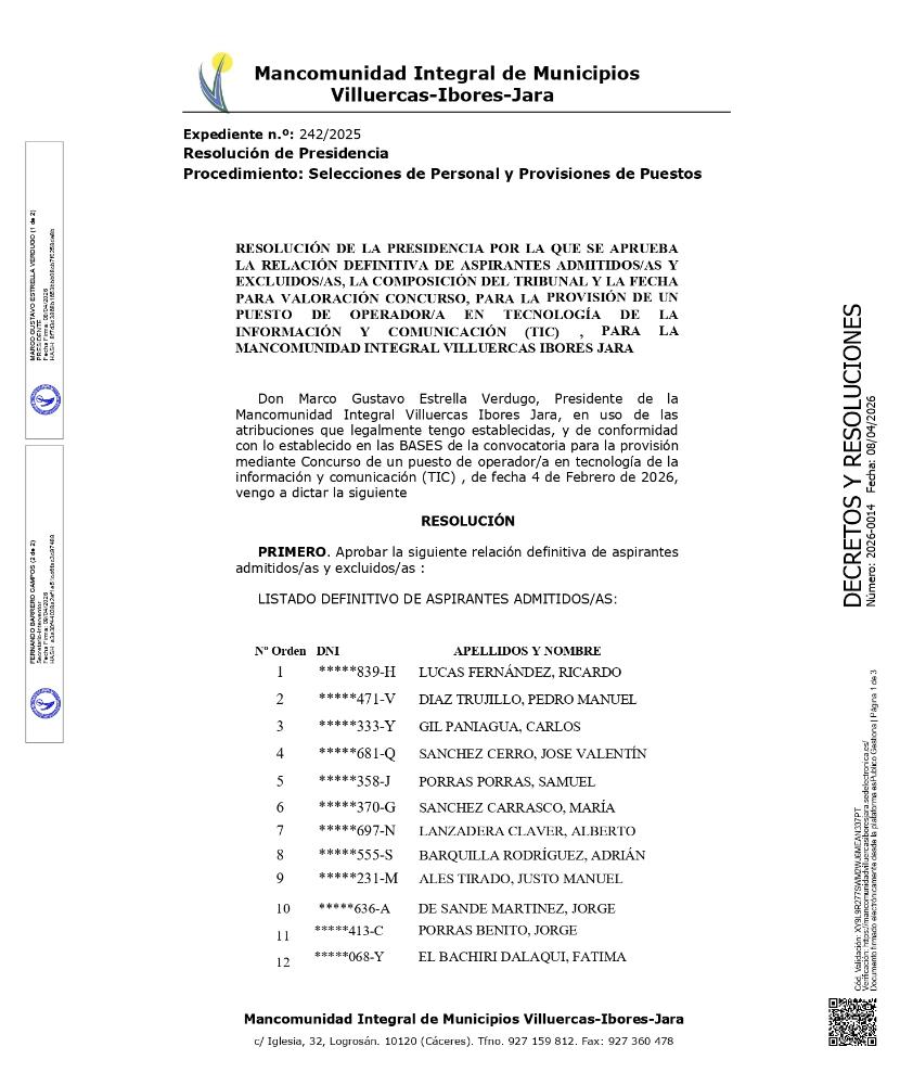 Resolución de la Presidencia por la que se aprueba la Relación Definitiva de aspirantes admitidos/as y excluidos/as y el tribunal para provisión mediante concurso de un puesto de Operador/a en Tecnología de la Información y comunicación (TIC).